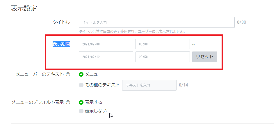表示期間が過去になっている場合はリッチメニューが表示されないので、新しい表示期間に変更しましょう。