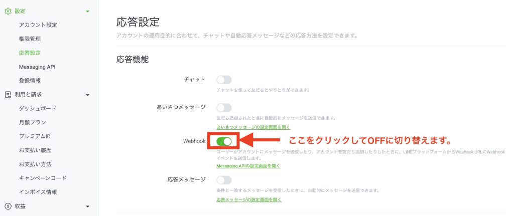 「応答設定」でWebhookをオフに切り替えて、