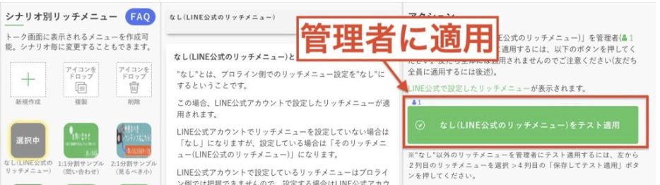 「なし(LINE公式のリッチメニュー)をテスト適用」をクリックしてください。