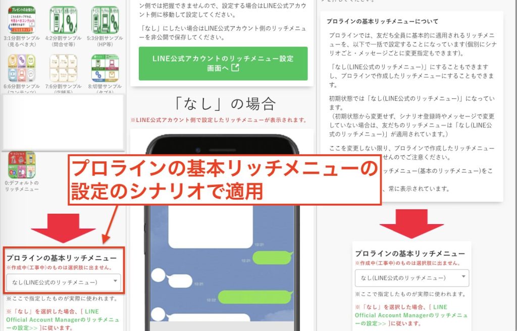 『プロラインの基本リッチメニュー』の設定がある場合には、『なし(LINE公式のリッチメニュー)』を選択して