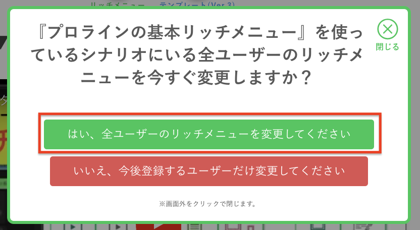 「はい、全ユーザーのリッチメニューを変更してください」を選択ください。