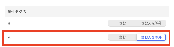 「属性タグAを含む人を除外して配信する」という以下のような設定がありますが、