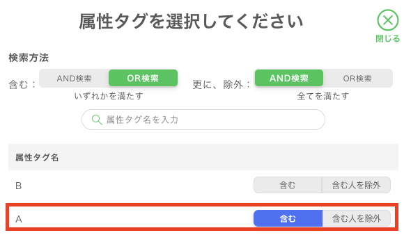「属性タグAを含む人に配信する」という以下のような設定や