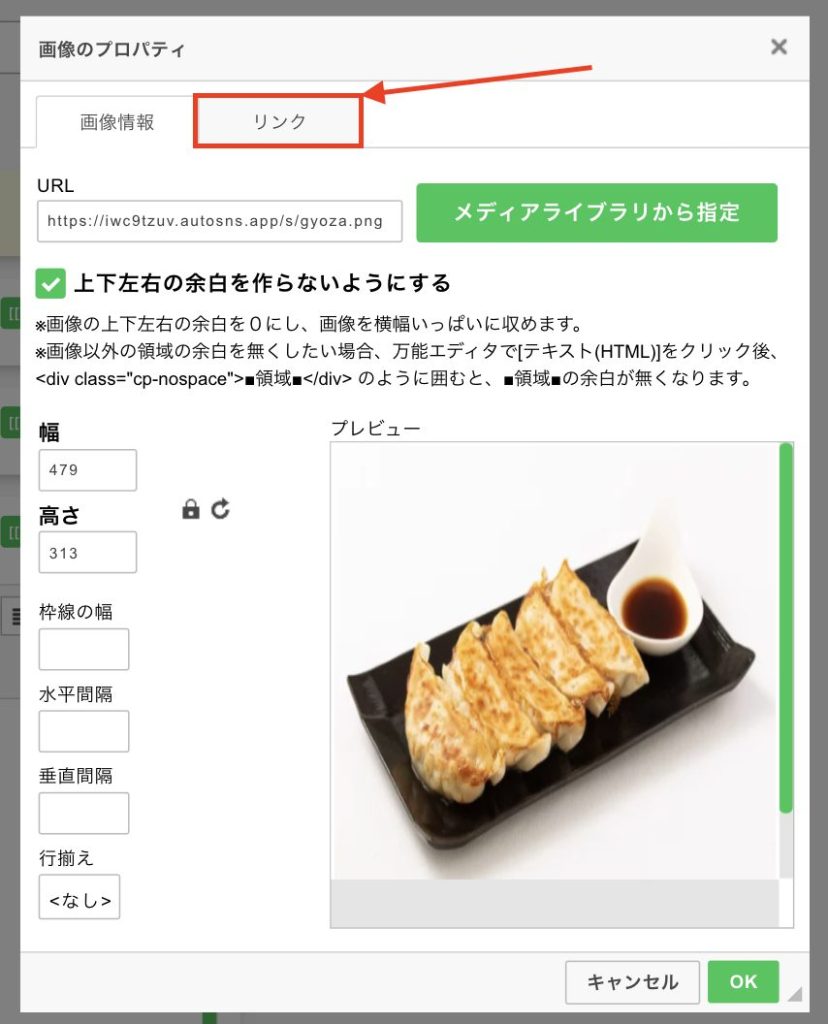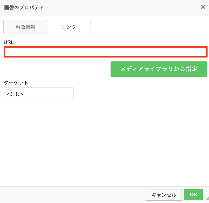 画像をタップした時に遷移するリンク先のURLを入力する欄がありますので、URLを入れて『OK』ボタンをクリックするとリンクになります。