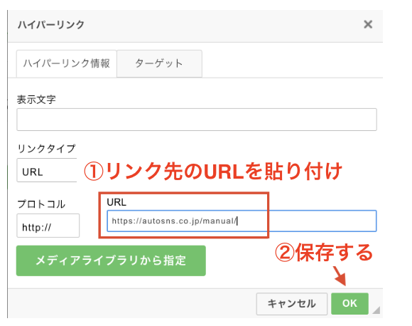 さらに、「表示文字」という部分にリンクで表示させたい文字を入力すると、