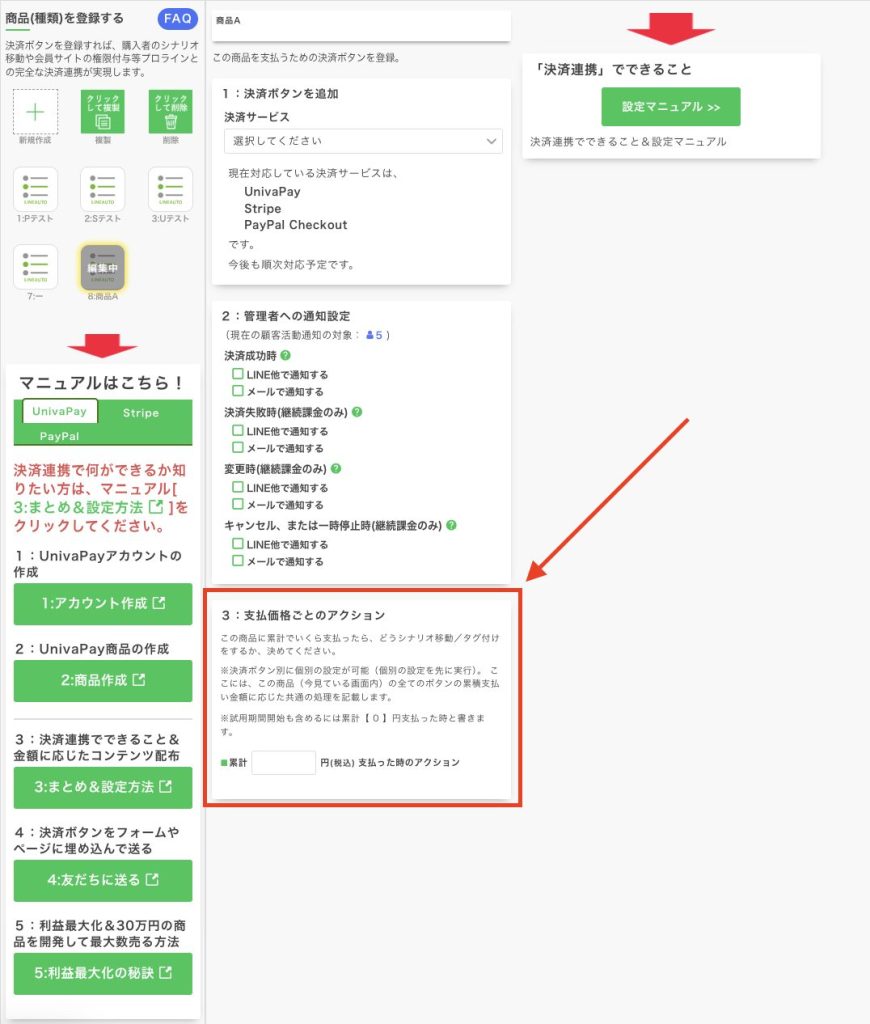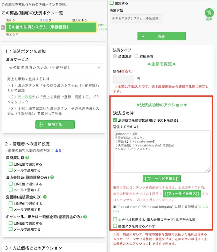 【支払価格ごとのアクション】で設定しておけば決済ボタンを事前に作成していなくても手動登録でシナリオ移動の動作が可能です。
