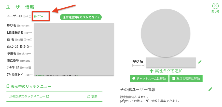友だち管理ページから該当者のアカウントをクリックすると、