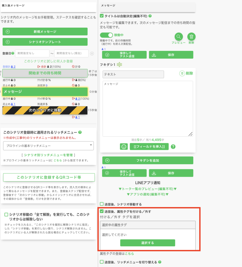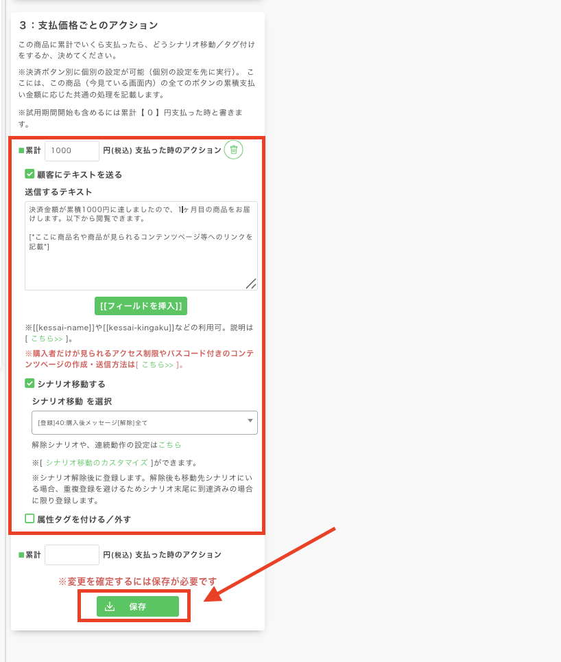 以下の枠内の金額・メッセージ・シナリオ移動などを設定して保存をすると、
