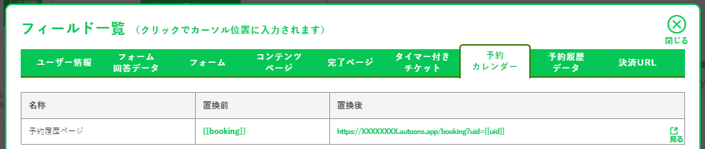 友達が [[booking]] または https://XXXXXXXX.autosns.app/booking?uid=[[uid]] にアクセスすると予約履歴ページが表示されます。