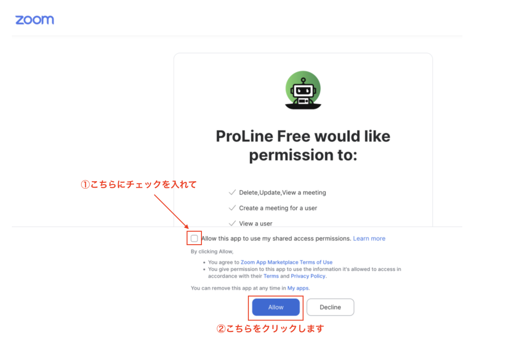 Zoomにサインインすると、以下のようにプロラインに対して共有アクセス権限を許可をしても良いかどうかの認証画面が表示されます。